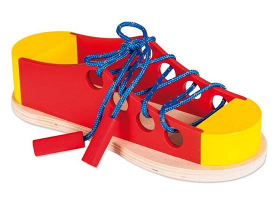 Przewlekanka Duży but to kolorowy, drewniany but z dużymi otworami, dziurkami i sznurowadłem zakończonym drewnianymi kołeczkami. Służy małym dzieciom do nauki sznurowania obuwia. Przez duże dziurki wygodnie przewleka się sznurowadło, stabilizowane przez kołeczki ułatwiające nawlekanie.