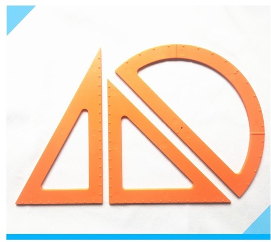W skład zestawu geometrycznego firmy Yuntai wchodzą linijka, dwie ekierki i półokrągły kątomierz. Wszystkie te przybory są wykonane z wytrzymałego plastiku w kolorze pomarańczowym i mają wyraźne, wypukłe oznaczenia.